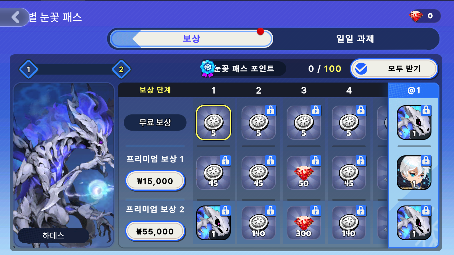 프리미엄 보상 2 | 눈꽃 주화 x1,540 보석 x900 열쇠 x150 물 속성 알(SS 등급) x5 하데스 x2 |