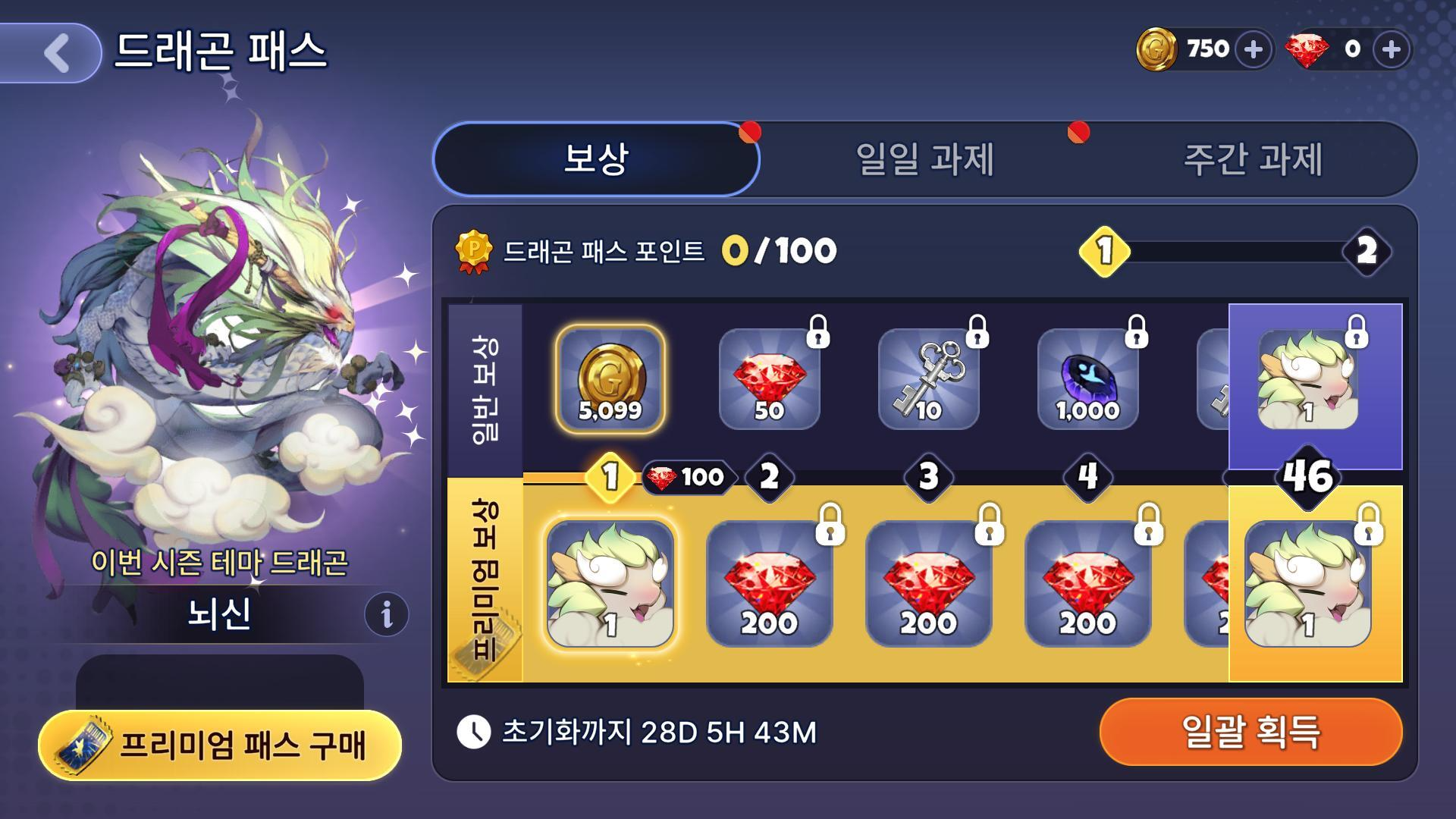 · 2월 1일에 추가되는 드래곤 패스부터 개편이 진행됩니다. · 보상이 변경되며 받을 수 있는 보상의 단계가 기존 30에서 46으로 확장됩니다. · 드래곤 패스에서는 신규 드래곤 ‘뇌신’ 을 획득할 수 있습니다. · 드래곤 패스가 개편됨에 따라 구매 가격이 상향됩니다. (기존 7,700원 → 29,000원) |