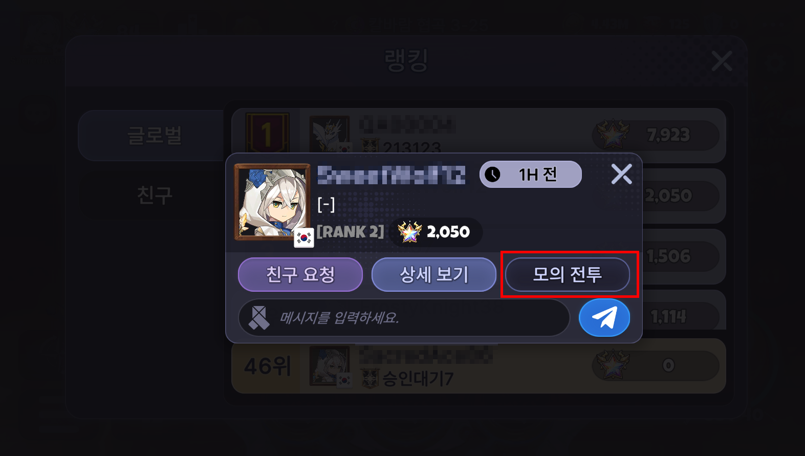 · 유저 상세 정보에서 모의 전투를 통해 드래곤 리그 전투를 진행할 수 있습니다. · 모의 전투는 전투만 진행하며 별도의 보상은 지급되지 않습니다. ※ 드래곤 리그를 한번도 플레이하지 않았을 경우, 모의 전투를 진행할 수 없습니다. |