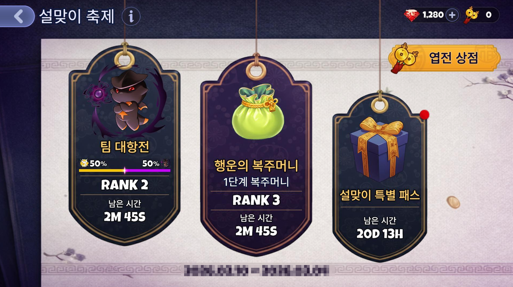 · 행운의 복주머니는 모든 테이머님 대상 30명씩 이벤트 그룹을 생성하여 진행됩니다. · 1일동안 복주머니를 통해 획득한 랭킹 포인트를 누적합니다. 행운의 매듭은 럼블머신을 통해 획득할 수 있으며 2000 획득 때마다 복주머니 열기 또는 업그레이드를 진행할 수 있습니다. · 복주머니 오픈 시 확률에 따라 성공 또는 실패가 정해집니다.