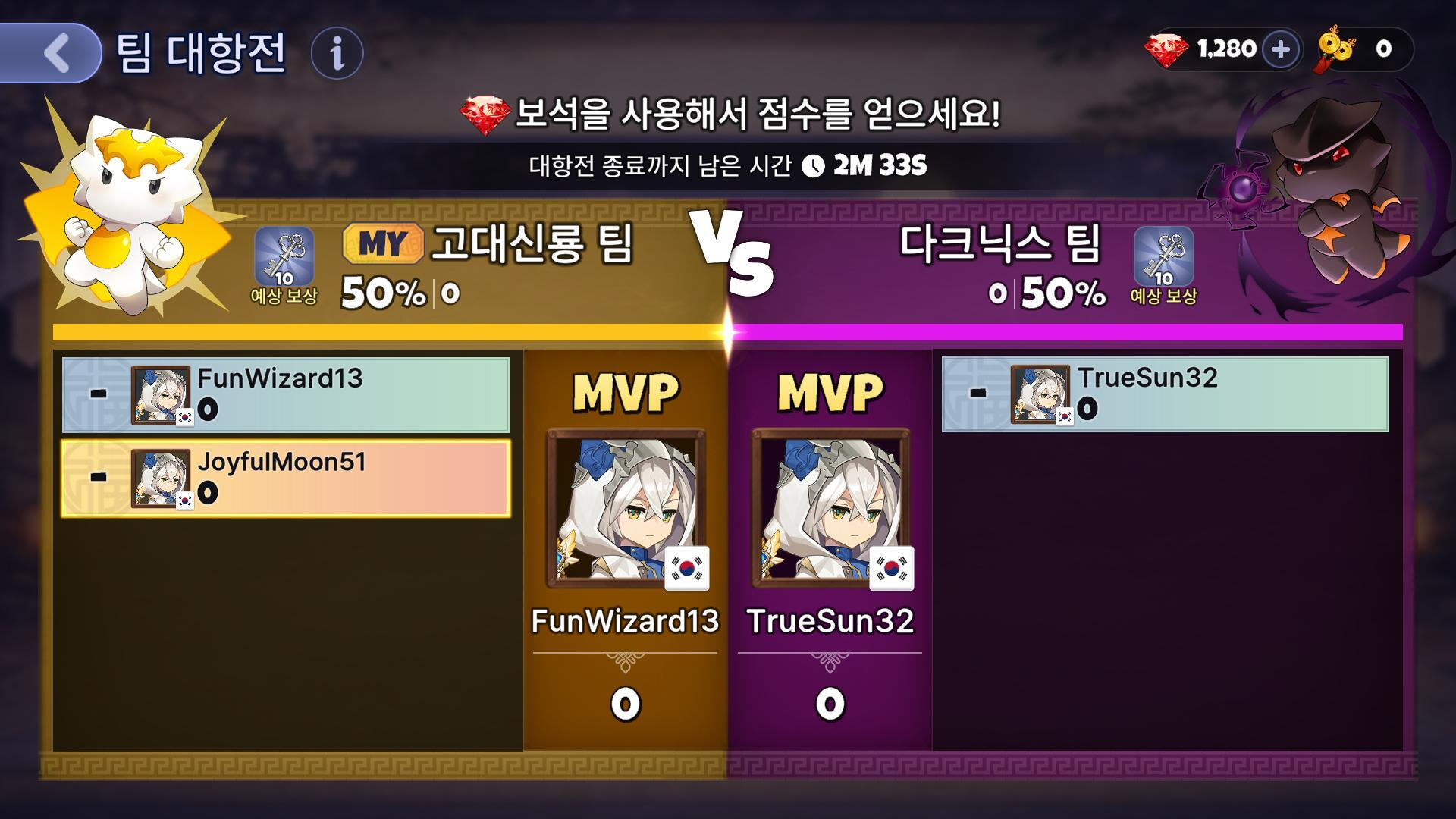 · 팀 대항전은 모든 테이머님 대상 40명씩 이벤트 그룹을 생성하여 20명씩 고대신룡 팀과 다크닉스 팀으로 나눠 진행됩니다. · 팀 대항전은 1일 동안 팀 별 미션 수행에 따라 점수를 획득할 수 있으며, 각 팀원들의 합산 점수를 기준으로 승/패가 결정됩니다. · 승패에 따라 보상은 모든 팀원에게 지급되며, 팀 내 랭킹에 따라 랭킹 보상이 추가 지급됩니다. ※ 1일 이후 이벤트 그룹은 재생성되어 진행됩니다. | |