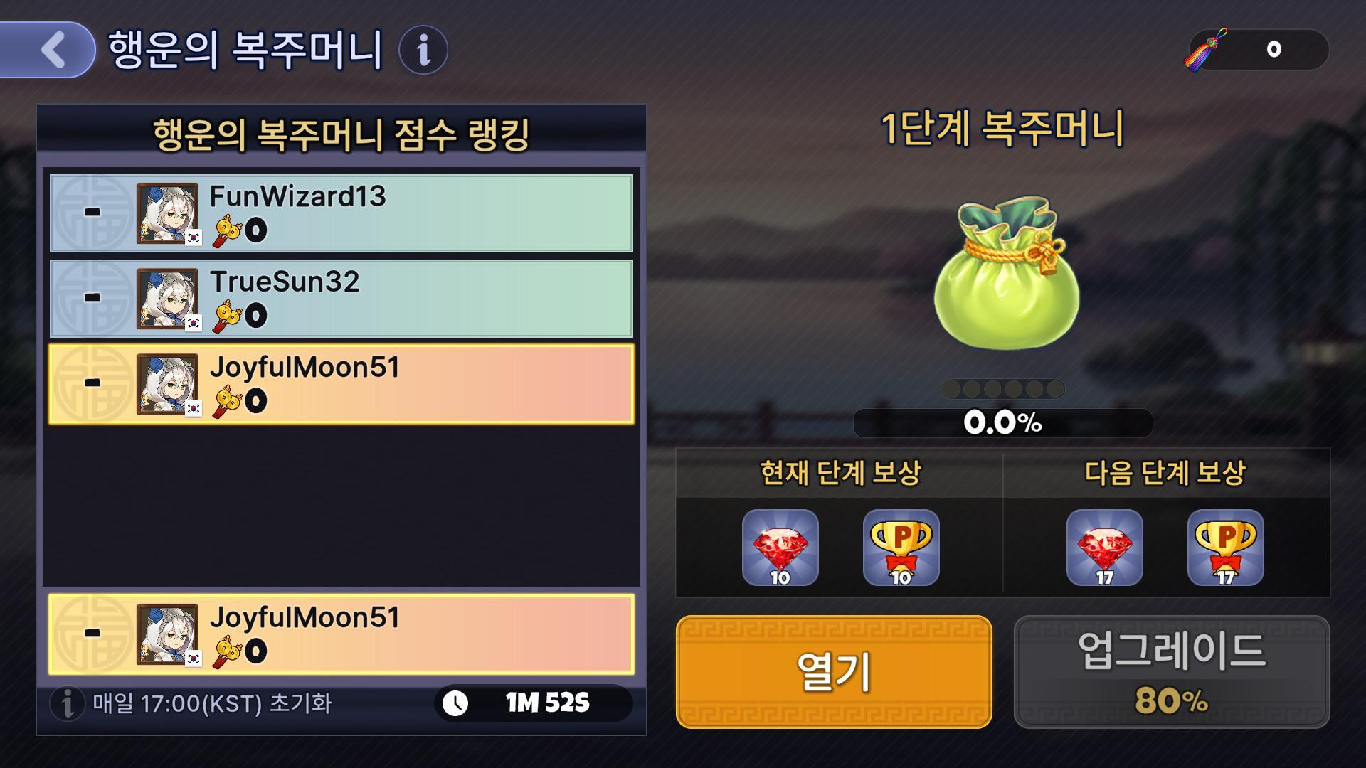 1 | 80% | 보석 x10 복주머니 랭킹 포인트 10 | 보석 x2 복주머니 랭킹 포인트 2 |