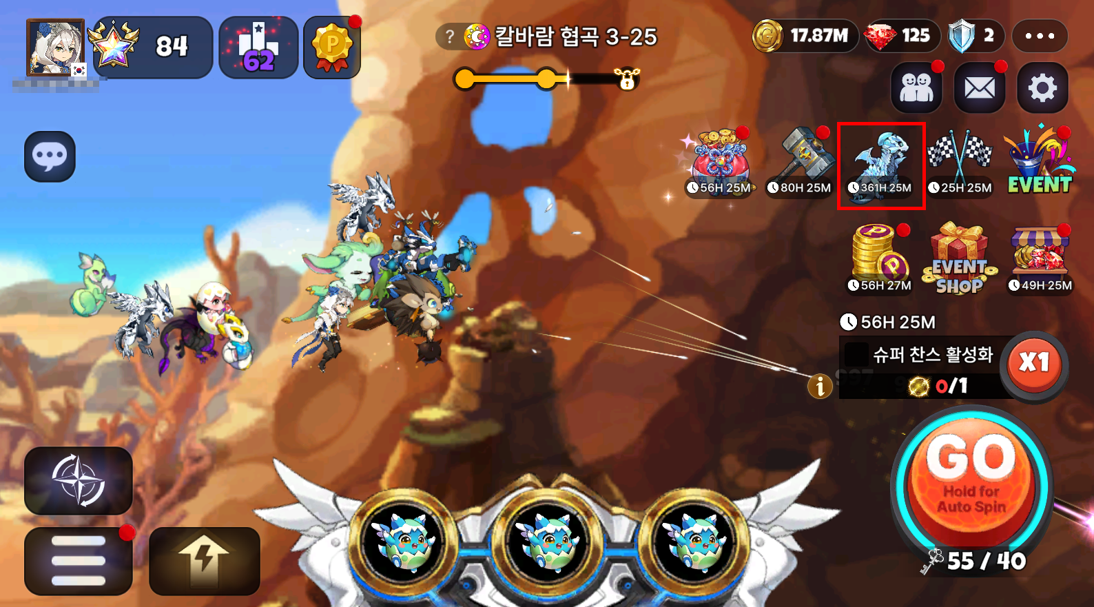 · 속도 2.5배 티켓이 추가되며, 사용 시 2.5배속으로 스테이지를 진행할 수 있습니다. · 속도 2.5배 티켓은 패키지 구매 및 누적 결제 이벤트에서 획득 가능하며, 추후 다양한 이벤트를 통해 획득할 수 있습니다. |