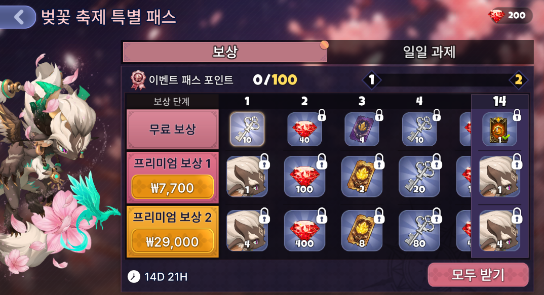 · 벚꽃 축제 이벤트 패스가 추가됩니다. · 벚꽃 축제 이벤트 패스에서는 전설 드래곤 선택권, 보물 소환 티켓, 열쇠, 보상 등 다양한 보상을 획득할 수 있습니다. · 벚꽃 축제 이벤트 패스 유료 보상으로 신규 드래곤 카마리, 프리미엄 보물 소환 티켓 등 추가 보상을 획득할 수 있습니다. |