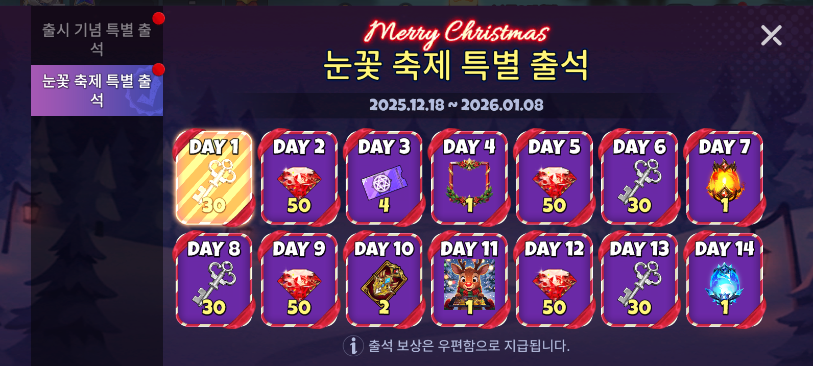 · 이벤트 기간 동안 매일 게임 접속 시 출석 보상 지급