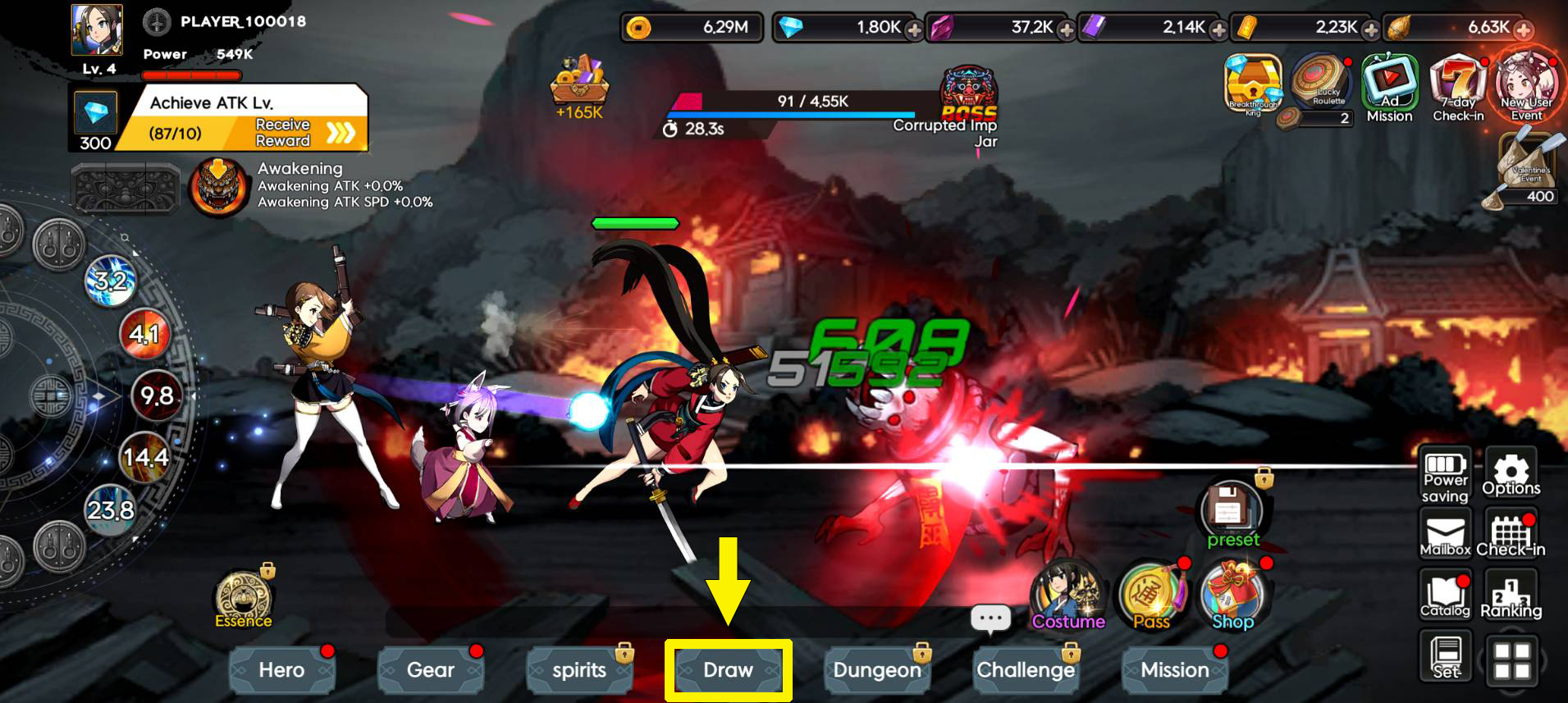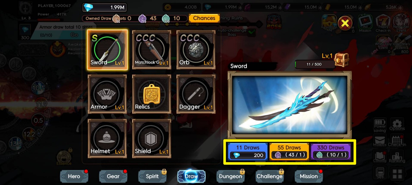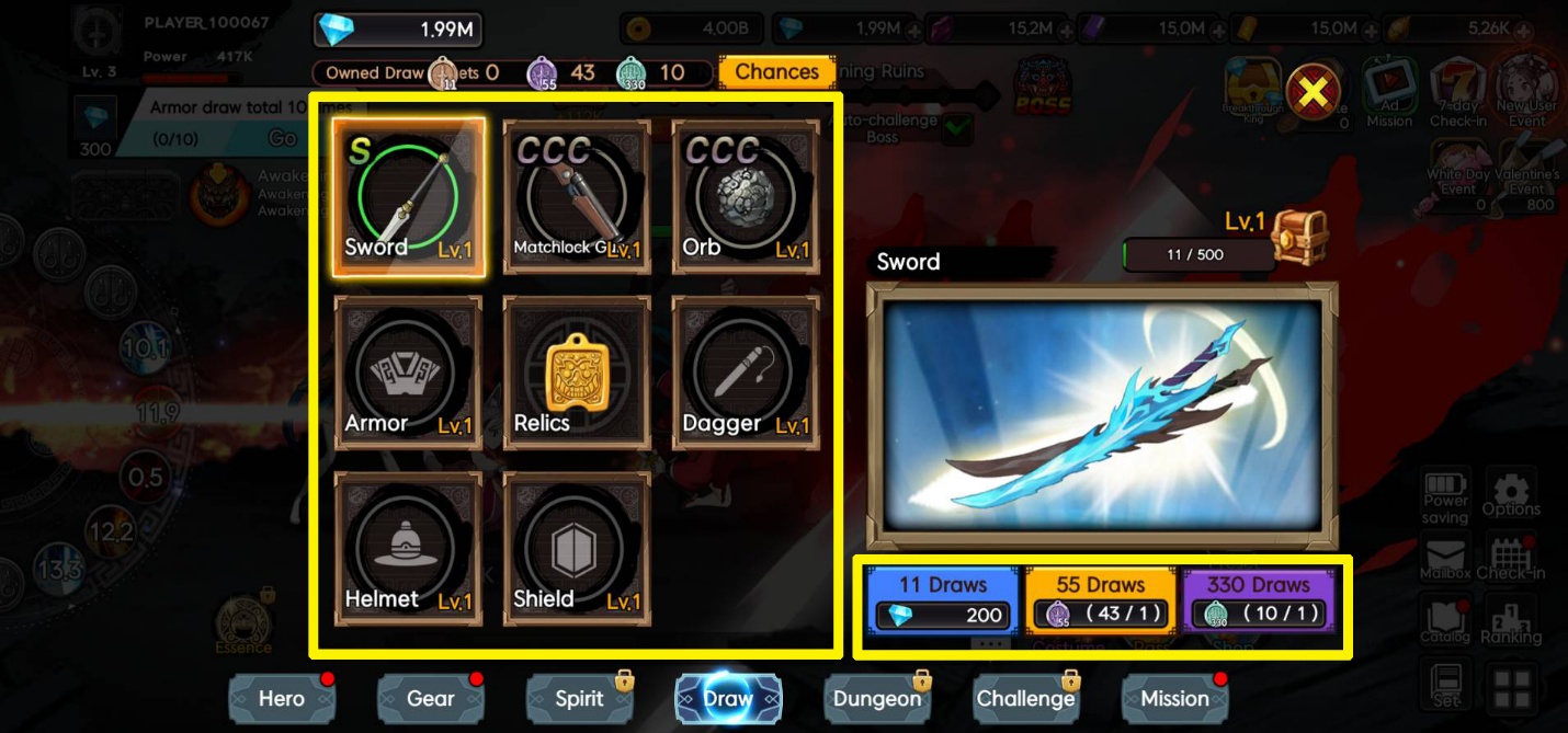 • • The Draw Feature allows you to obtain various gear, such as weapons, armor, and accessories, to enhance your character's performance.
