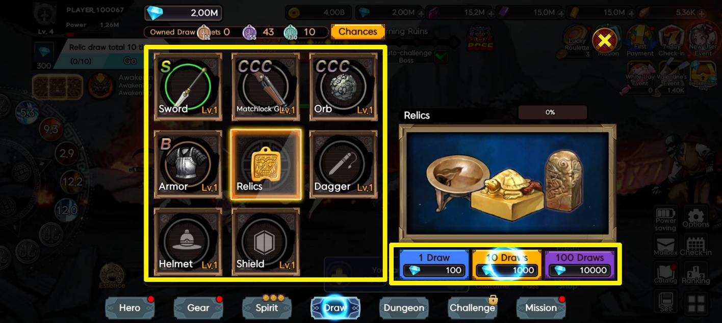 2. 2. Select the type of gear you want to draw and choose the draw option you wish to perform. Please note that the draw cost for Relics differs from other types of gear.