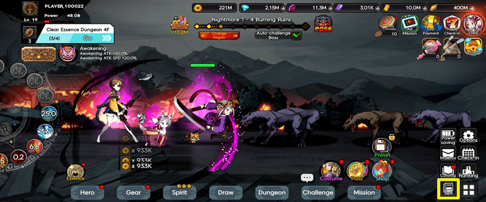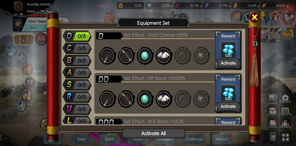 - • The Set Feature focuses on obtaining a complete set of gear of various types, for example a D-grade Sword, Gun, Orb, Relic, and Armor. Completing a set unlocks rewards.
