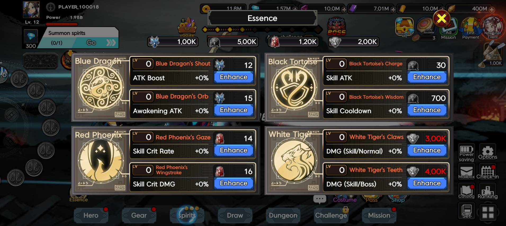 โขEssences are a vital resource for enhancing your abilities. They are categorized into four distinct types: Blue Dragon, Black Tortoise, Red Phoenix, and White Tiger. Each type offers unique enhancements that contribute to your growth. Please note that as the level increases, the amount of essence required for upgrades also increases.