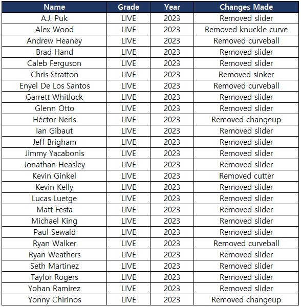 - Some pitches of players with extremely low pitch percentages (less than 0.1%) have been adjusted based on the most recent data.