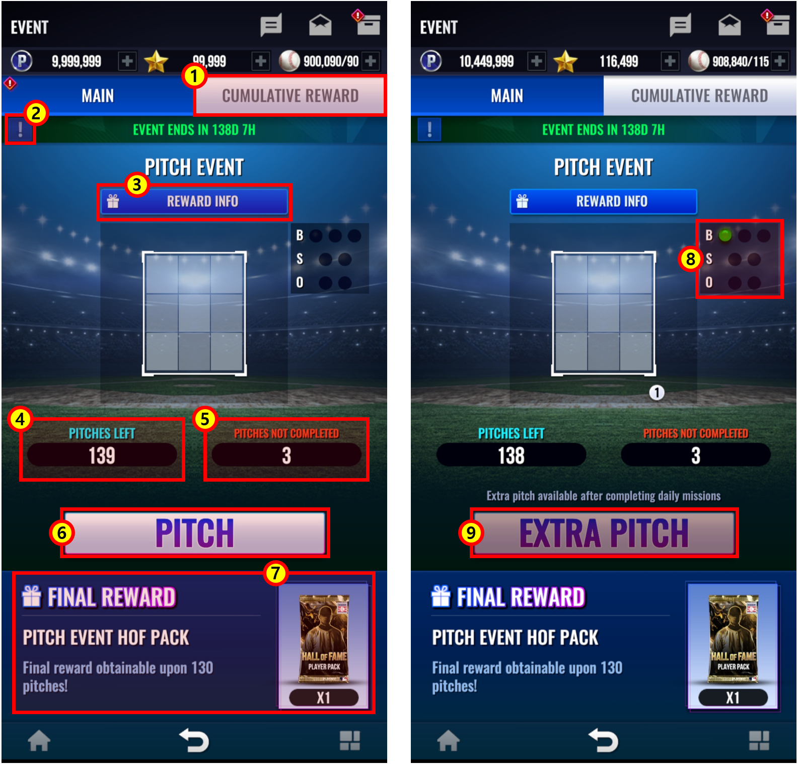⑨ You can throw additional pitches if you have extra pitch attempts.