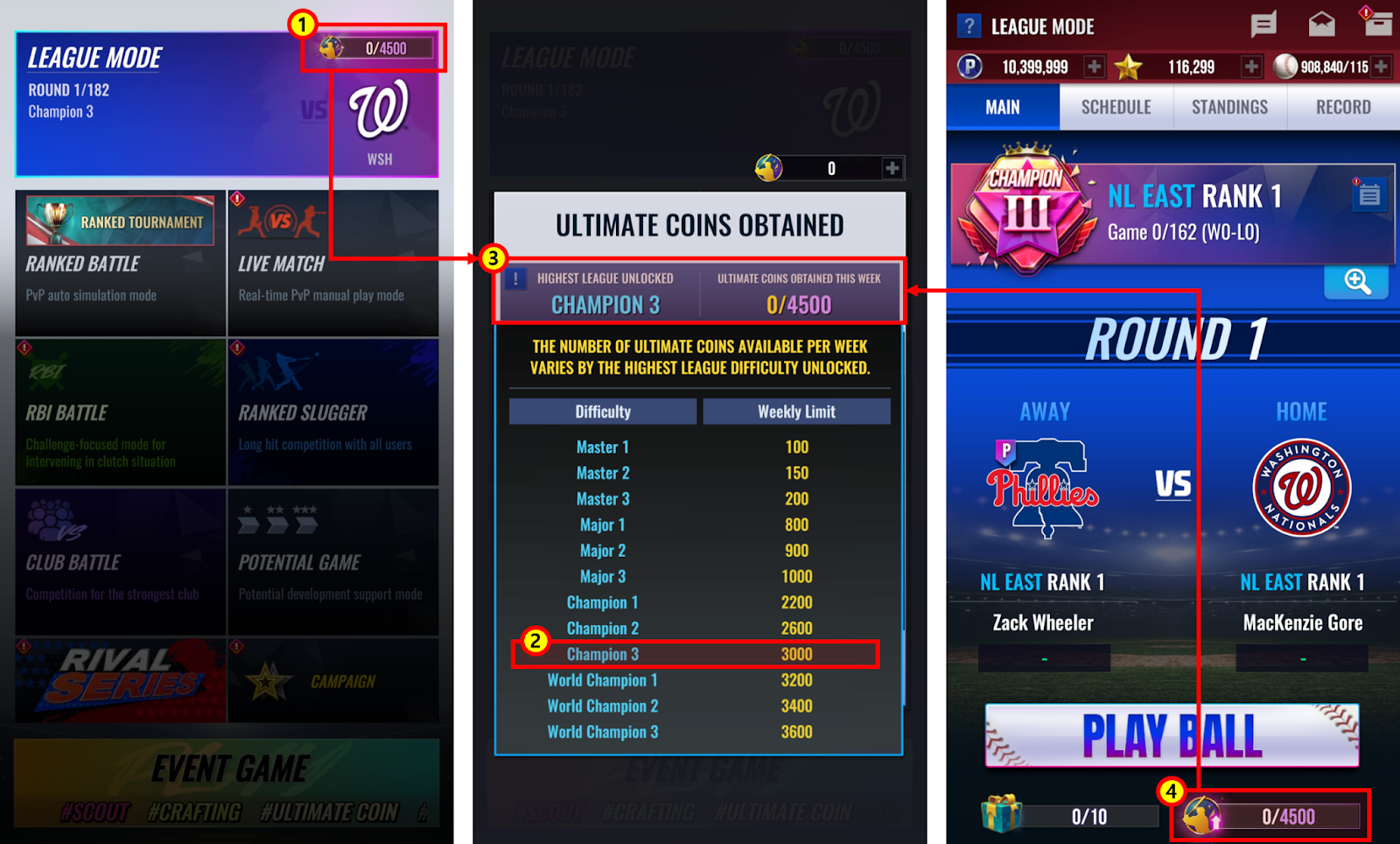 ③ Your current highest League difficulty. The higher your difficulty, the more Ultimate Coins you can earn weekly—including boosted event limit.