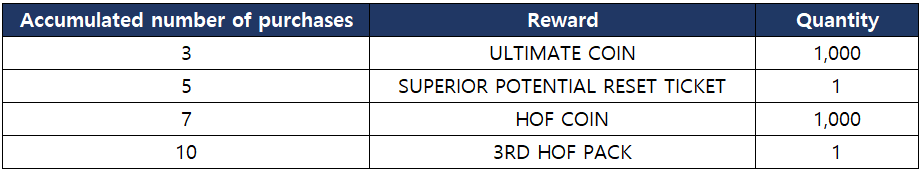 - The following rewards can be obtained based on the number of 3rd HOF Special Packages you purchased in total.