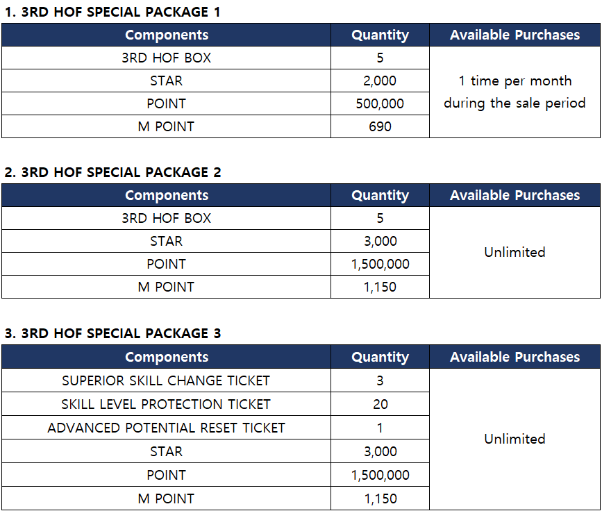 - The number of accumulated purchases from the 3rd HOF Special Package will not carry over to the next batch of HOF packages.