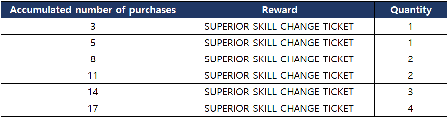 - The following rewards can be obtained based on the number of Skill Change Super Packages you purchased in total.