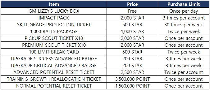 Please read below for details on the [Special Event Shop] that offers a free GM Lizzy's Lucky Box each day and various items purchasable with Stars and Points.