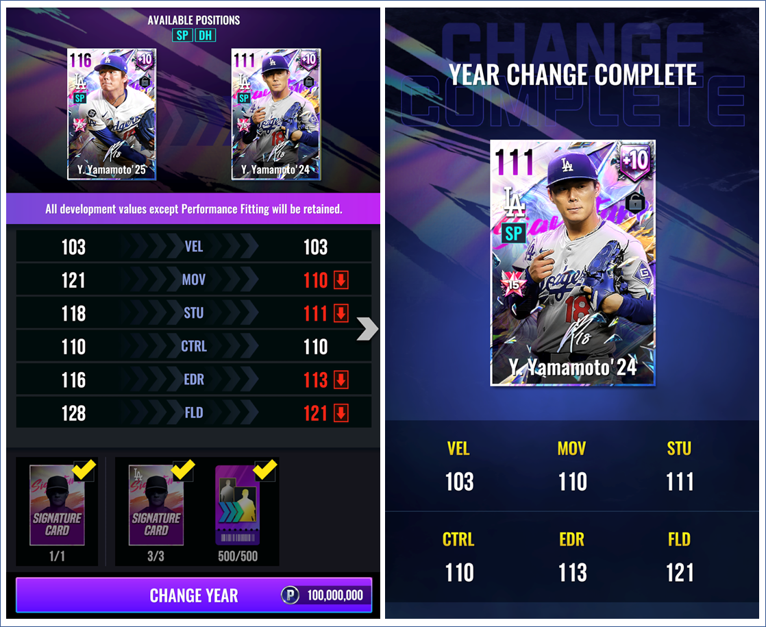 - In the v3.08.00 update, only Signature Black Cards for Starting Pitcher (SP) and Designated Hitter (DH) positions can be recruited.