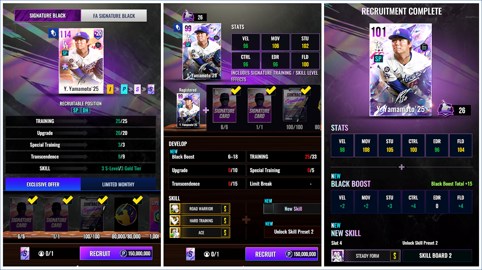 * When recruiting a two-way player as a Signature Black Card, both the batter and pitcher cards will be recruited as Signature Black Cards, just as with a Rarity Boost.