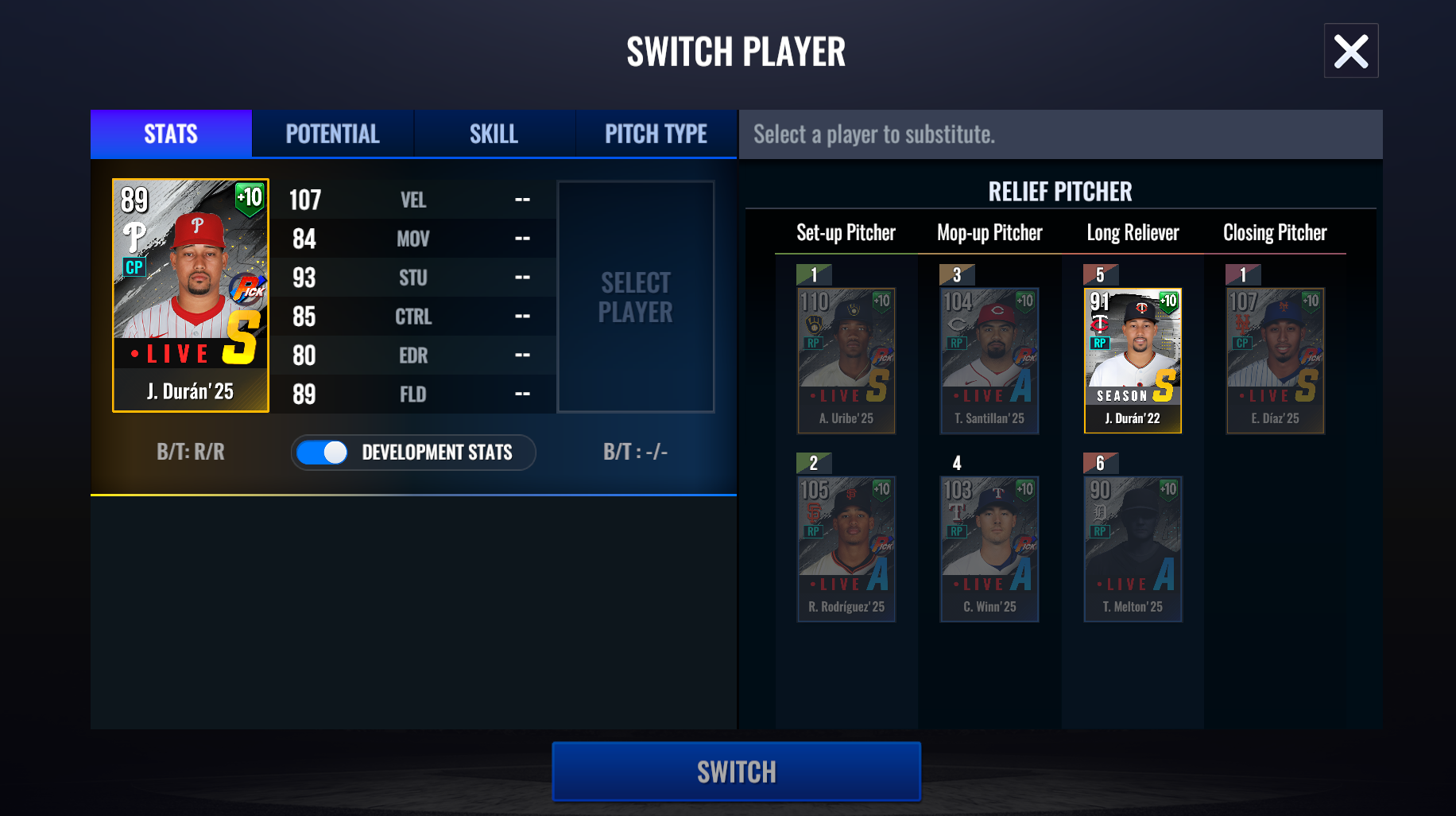 Recently I got Jhuan Dur'an as a closer. And he's great and all. But, he isn't registering as a closer when I go to try and select him in my rival series line up. I've tried to see what's going on, and it seems he's been designated as a relief pitcher? Anyway, I'm providing screenshots of what I am talking about.