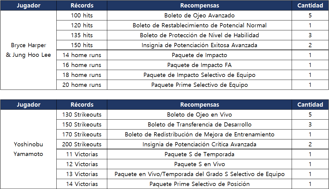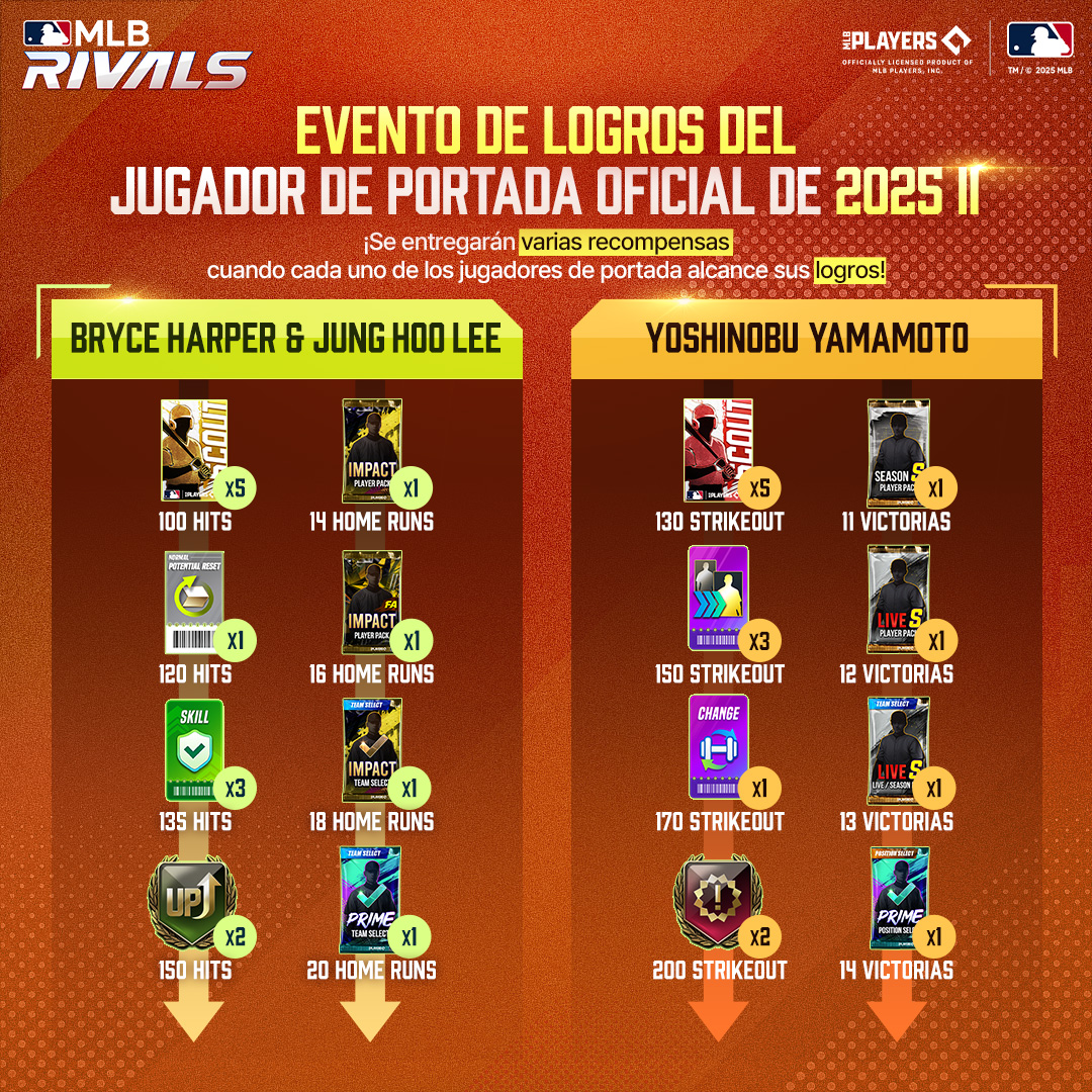 - Obtén recompensas a medida que cada jugador de portada, Bryce Harper (PHI), Yoshinobu Yamamoto (LAD) y Jung Hoo Lee (SF), alcance los hitos que se indican a continuación.