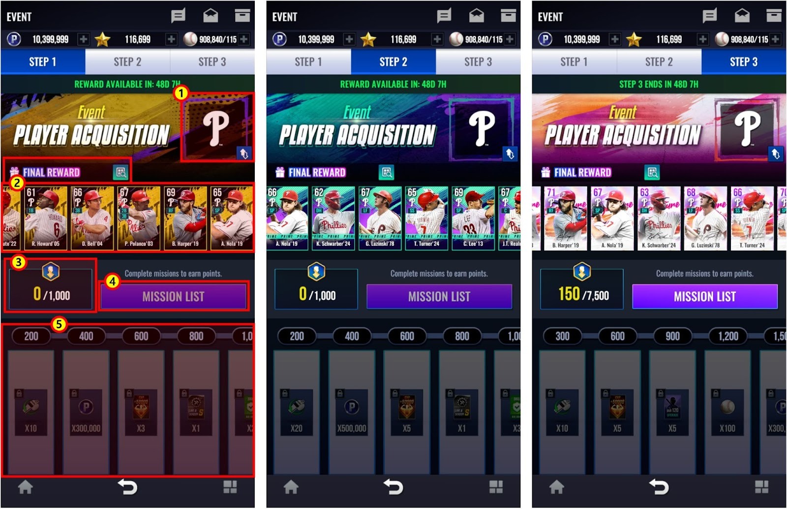 * Acumula 1.000/1.000/7.500 Puntos de Evento en cada PASO para reclutar a uno de los jugadores disponibles.