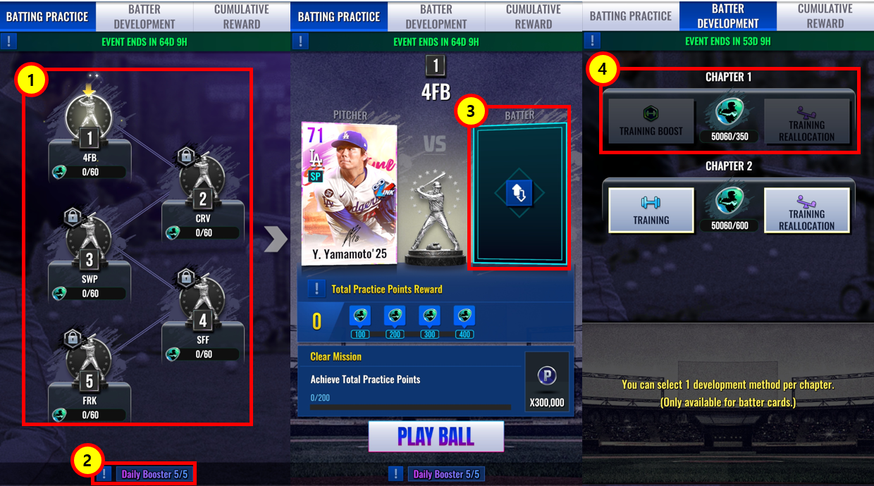 Capítulo 2 | [Entrenamiento] Se entregan 3.000.000 de EXP de Entrenamiento Cartas objetivo: Distintivo (FA, WBC), Prime (FA, WBC), Momento | [Redistribución de Entrenamiento] Se redistribuyen las estadísticas aumentadas por el Entrenamiento. (Se seleccionan al menos 3 estadísticas) Cartas objetivo: Distintivo (FA, WBC), Prime (FA, WBC), Momento, HOF | Acumulación de 600 Fichas del Entrenamiento de Bateo y 9 días después de la apertura del evento |