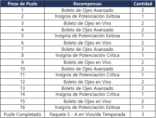 - Obtendrás una recompensa por completar el puzle (Paquete S-A en Vivo/de Temporada x3).