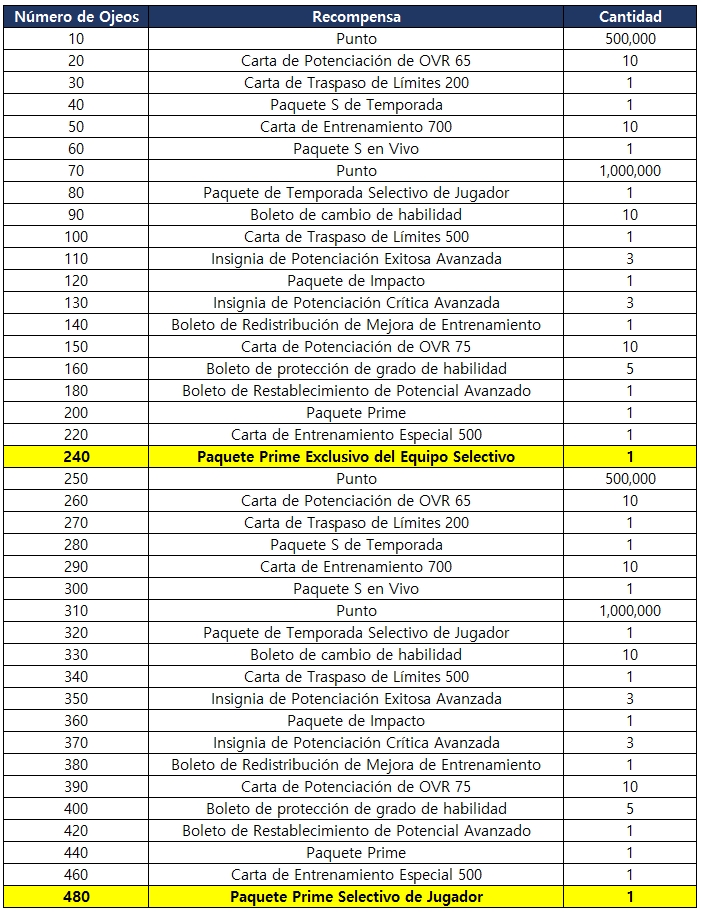 - Puedes obtener el [Paquete Prime Exclusivo Selectivo del Equipo] si realizas 240 Ojeos Especiales de la Apertura de Temporada.