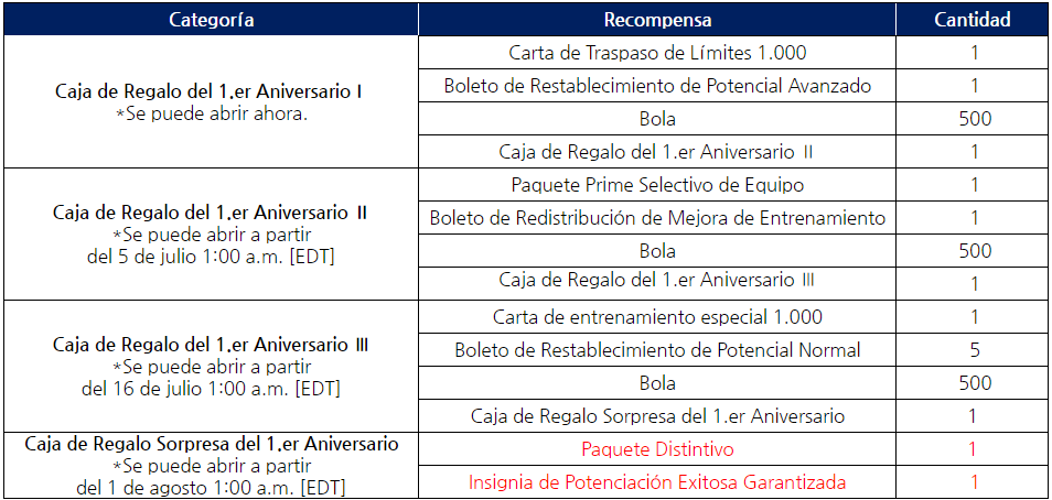 ※ Estarán disponibles una Insignia de Potenciación Exitosa Garantizada que aumenta la probabilidad de éxito al 100% y un Paquete Distintivo que contiene una Carta Distintiva Aleatoria en la Caja de Regalo Sorpresa del 1.er Aniversario. <Revelación adicional: 4 de julio 11:00 p.m. [EDT]>