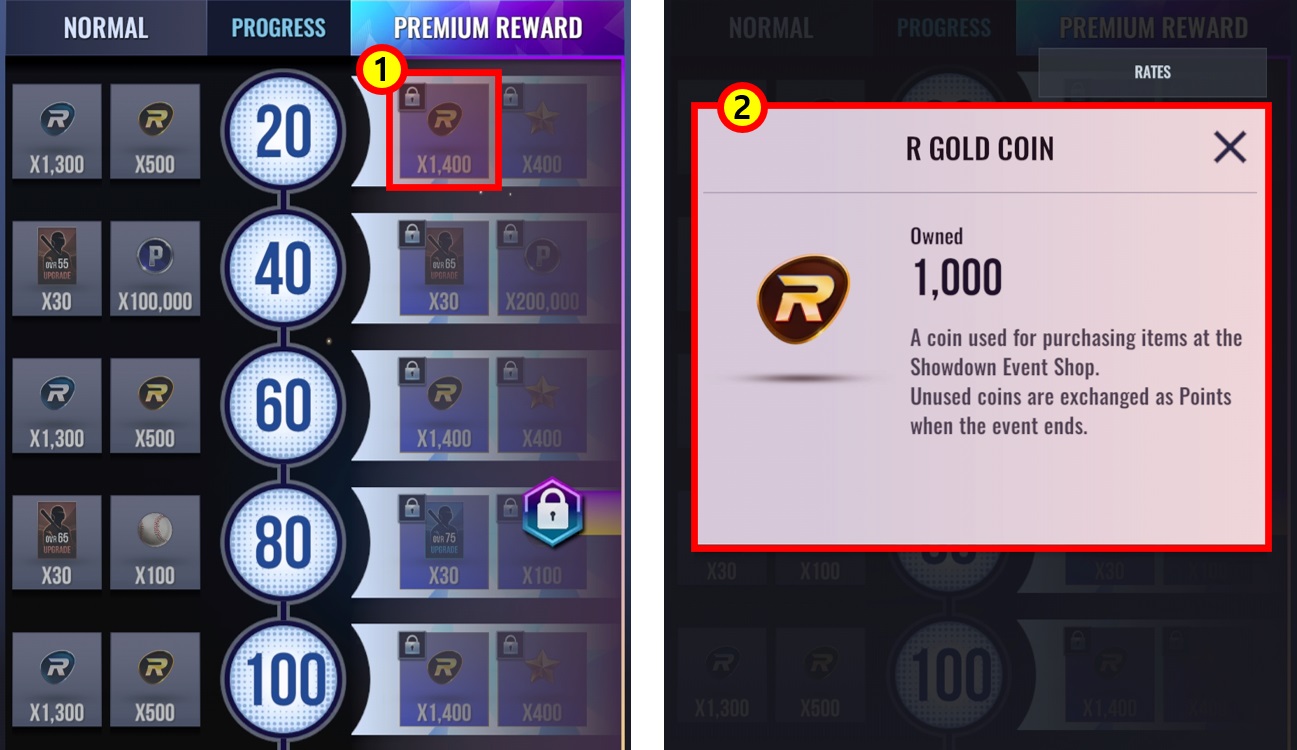 ① Pulsar la recompensa de las Monedas Plateadas R y de las Monedas Doradas R dentro de la Recompensa Normal y Premium.