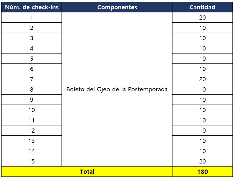 - Puedes obtener hasta 180 Boletos del Ojeo de la Postemporada a través del Evento de Check-in durante 15 días.