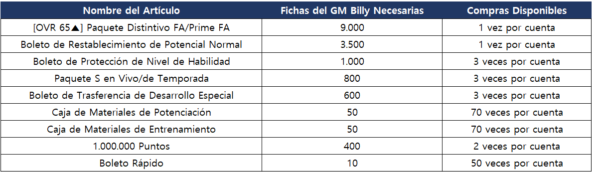 - Puedes comprar los artículos en la Tienda de Evento con las Fichas del GM Billy obtenidas en el Partido de Evento.