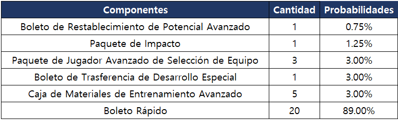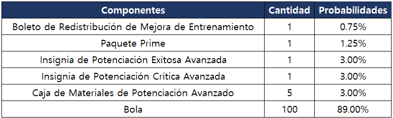 - Puedes obtener uno de los componentes con una cierta probabilidad al abrir la Caja de Regalo Diario 1.