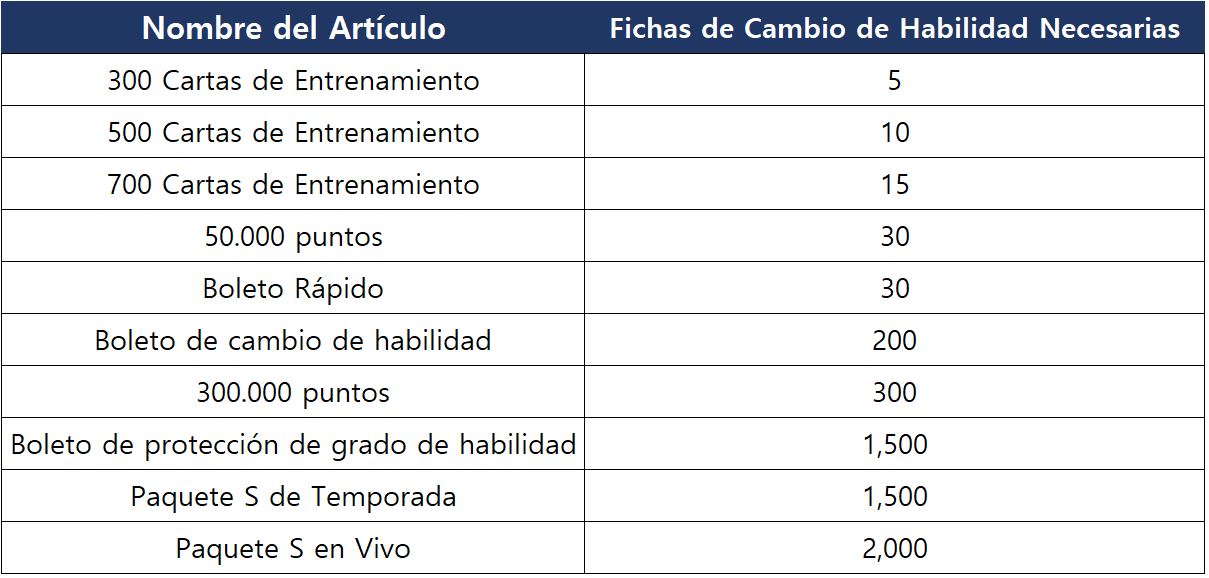 - ¡Completa el Partido de Evento para obtener Fichas de Cambio de Habilidad y cámbialas por los artículos deseados en la Tienda de Eventos!