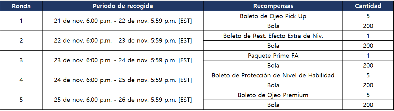 - Las recompensas se entregarán al Buzón con el primer inicio de sesión de cada ronda.