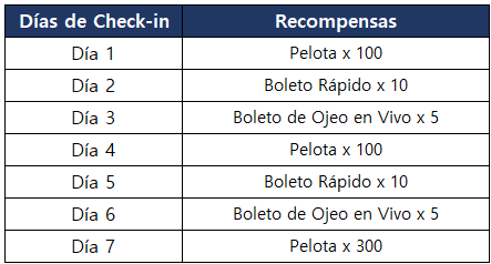 ¡Inicia sesión del juego por siete días durante el periodo del evento para obtener recompensas como 500 Bolas y 20 Boletos del Juego Rápido!