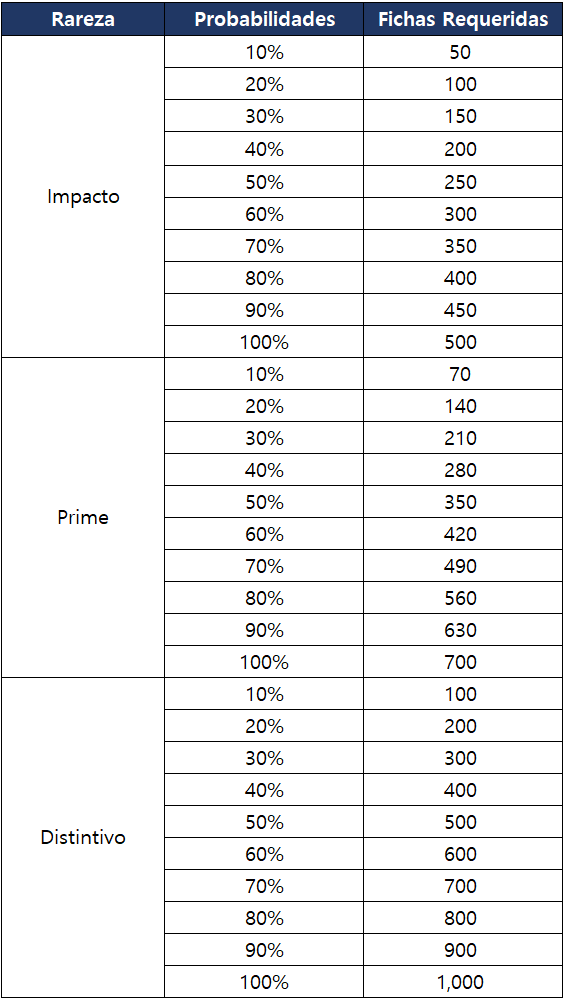 - Son las probabilidades y la cantidad de Fichas requeridas para aumentar 1 nivel de la Trascendencia.