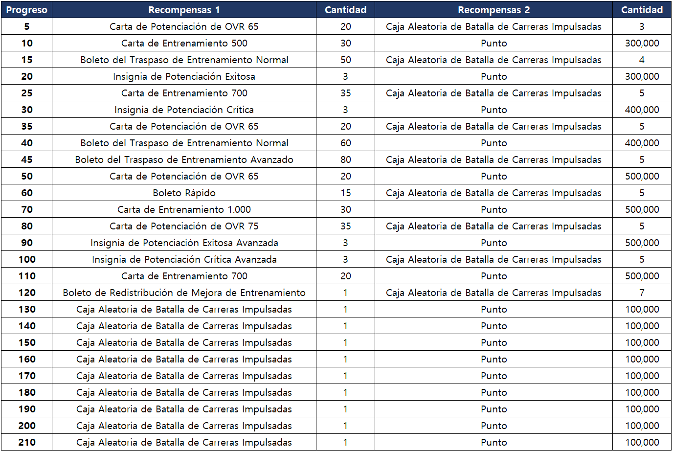 - Puedes obtener las siguientes recompensas según las carreras anotadas en la Batalla de Carreras Impulsadas durante el periodo del evento.
