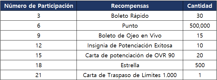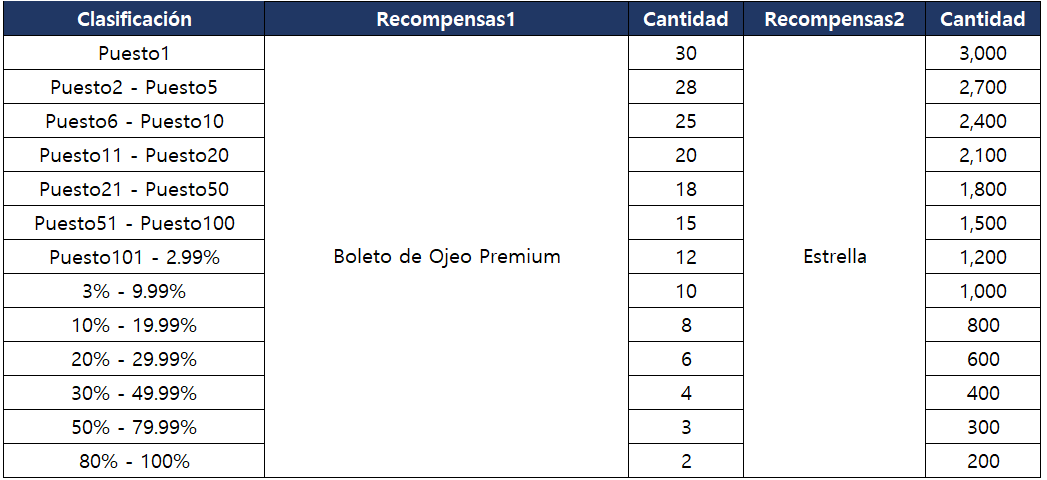 ※ Los que empaten reciben la misma recompensa independientemente del número de personas que la hayan conseguido.
