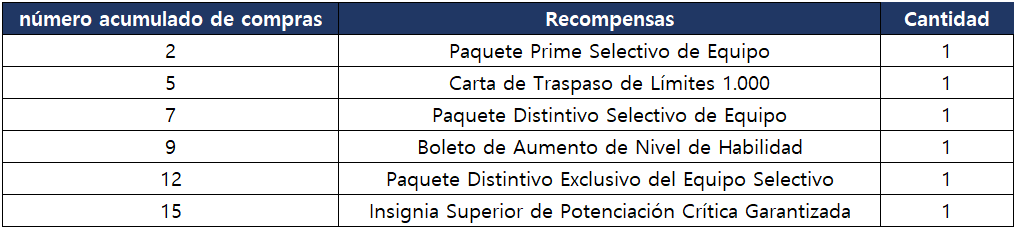 - Puedes obtener las siguientes recompensas según el número acumulado de compras del Paquete de Temporada.