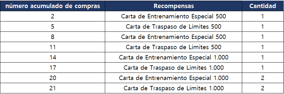 - Puedes obtener las siguientes recompensas según el número acumulado de compras del Paquete Especial Selectivo de Posición.