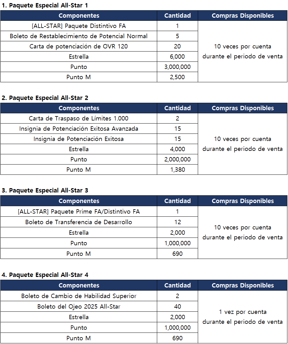 - Los [Boletos del Ojeo de Evento 2025 All-Star] obtenidos del Paquete Especial All-Star 4 también estarán disponibles hasta el 11 de agosto 12:59 a.m. EDT.