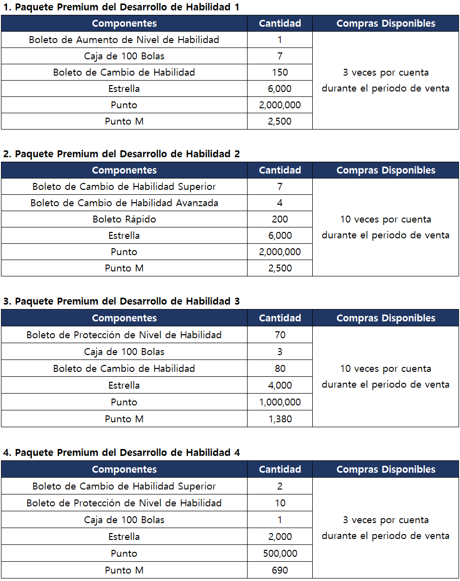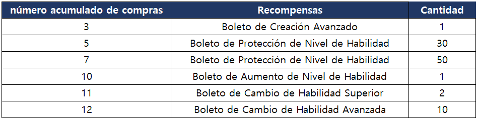 - Puedes obtener las siguientes recompensas según el número acumulado de compras del Paquete Premium del Desarrollo de Habilidad.