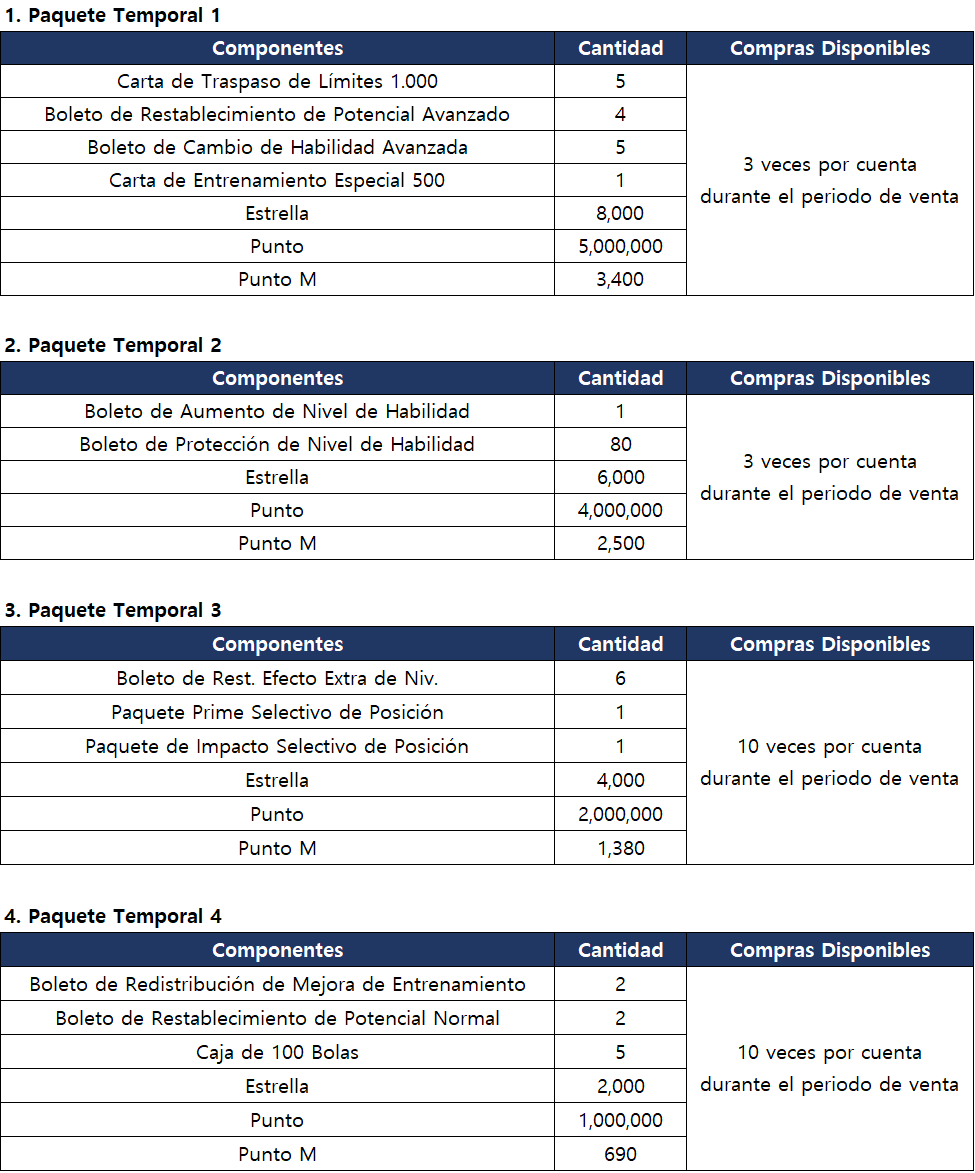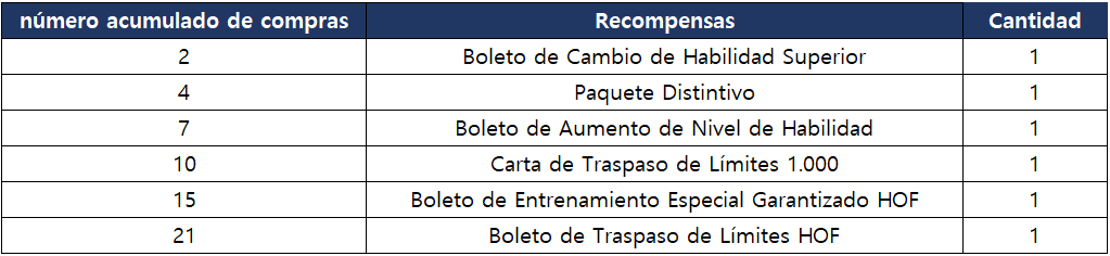 - Puedes obtener las siguientes recompensas según el número acumulado de compras del Paquete Temporal.