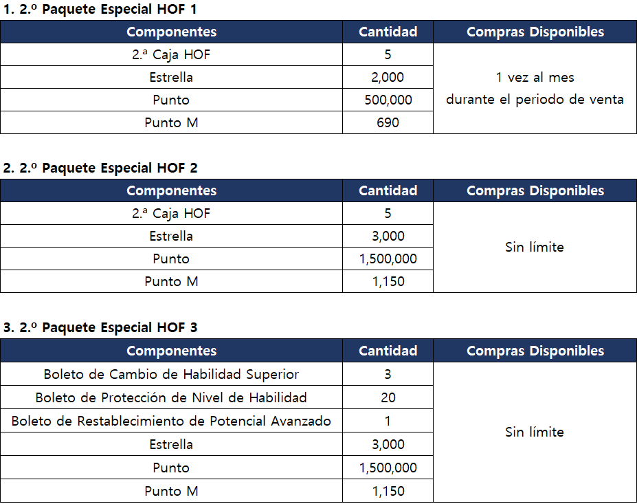 - La cantidad de compras acumuladas del 2.º Paquete Especial HOF no se transferirá al siguiente lote de paquetes HOF.