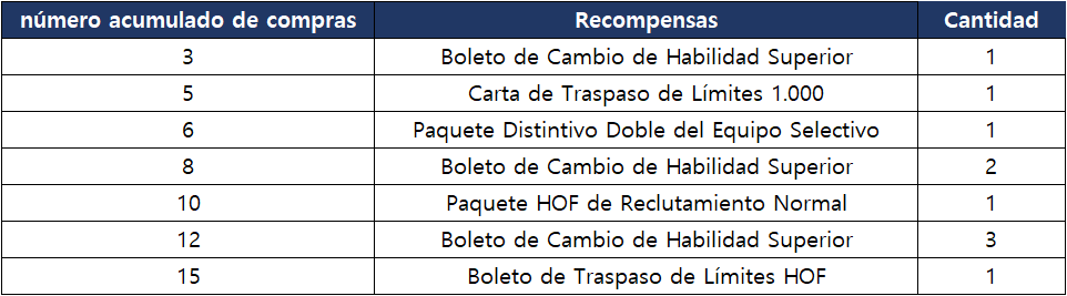 - Puedes obtener las siguientes recompensas según el número acumulado de compras del Paquete de Temporada.