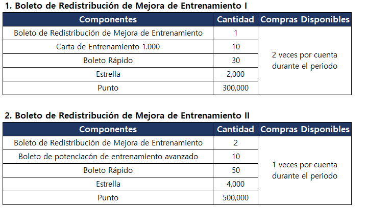 El [Paquete de Redistribución del Desarrollo del Entrenamiento], que ofrece Boletos de Redistribución del Desarrollo del Entrenamiento y otros artículos, estará disponible para la compra.