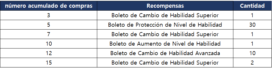 - Puedes obtener las siguientes recompensas según el número acumulado de compras del Paquete Premium del Desarrollo de Habilidad.