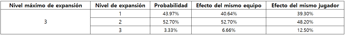 - Las probabilidades aplicadas al realizar la Expansión de Potencial se están aplicando correctamente conforme a la intención de diseño, y las probabilidades reales aplicadas son las siguientes.