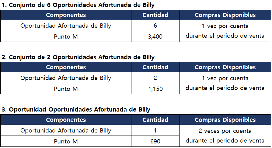 - Puedes obtener 1 artículo de la lista con una probabilidad fija cuando se abre la Oportunidad Afortunada de Billy.